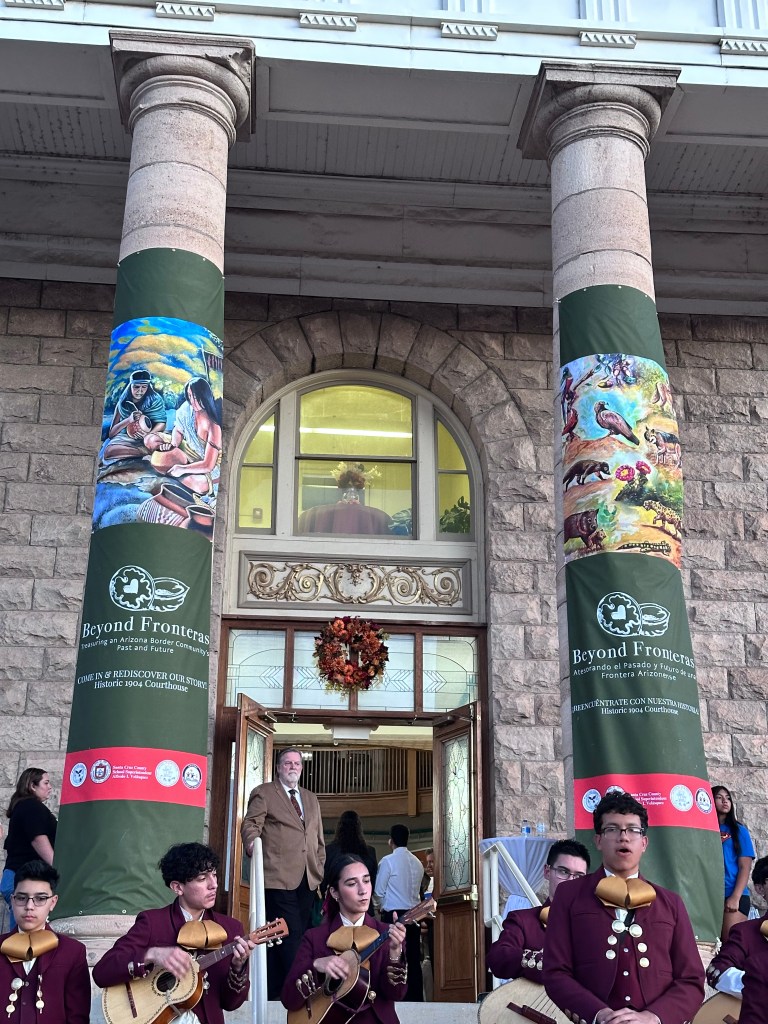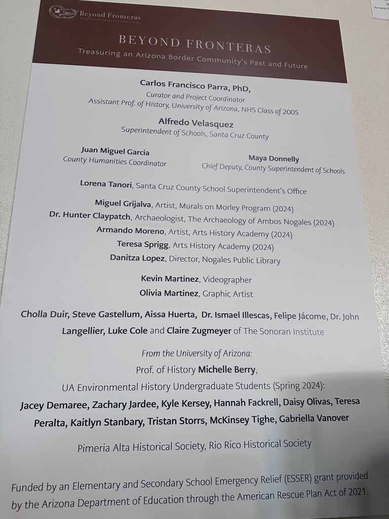 Vibrant public history brings communities together and showcases stories that are otherwise difficult to find. These attributes perfectly describe the Beyond Fronteras: The Nogales and Santa Cruz County History Proejct. The project director and coordinator is UArizona’s very own Carlso Parra. Dr. Parra developed Beyond Fronteras with funding from an Elementary and Secondary School Emergency Relief (ESSER) Grant provided by the Arizona Department of Education to the Santa Cruz County School Superintendent’s Office. It is Nogales’ first bilingual local history exhibit.